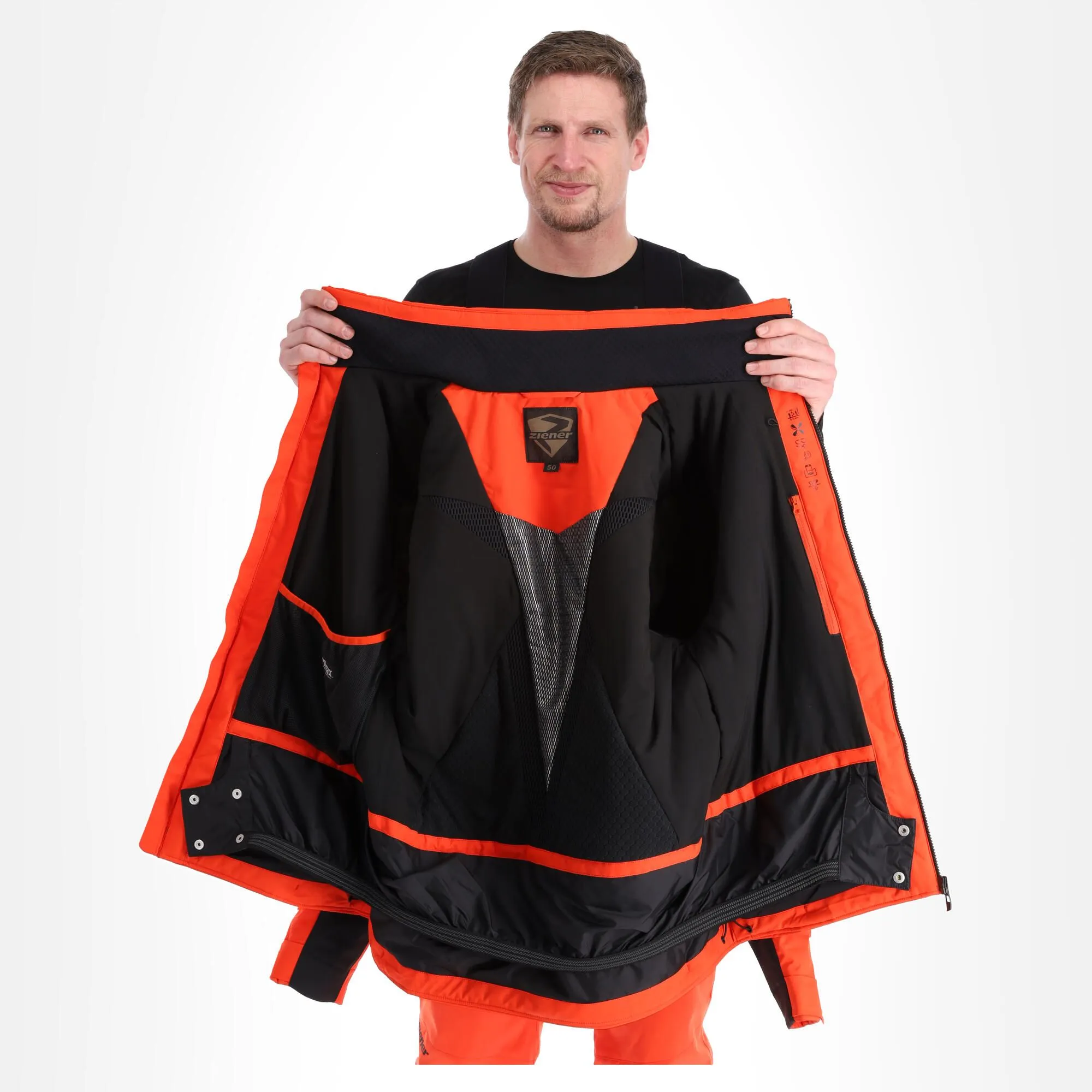 The highly functional, padded ZIENER men’s ski jacket TOROA MAN impresses with its high-quality features. The breathable, wind- and waterproof Dermizax® membrane is extremely durable and high-performance. The elastic outer material and elastic lining also provide maximum freedom of movement. 100g/m² padding made of very breathable and lightweight insulating material keeps the heat balance even when wet – ensuring high wearing comfort. Special heat zones and side ventilation channels ensure an optimal body climate. The jacket is PFC-free thanks to its environmentally friendly waterproofing. A detachable, adjustable functional hood, inner cuffs, waterproof front zip and zippered pockets as well as the snow guard come as standard. Numerous features such as pockets for ski goggles and sunglasses as well as for smartphones plus a ski pass pocket on the left arm make this jacket the perfect choice on the ski slopes.
